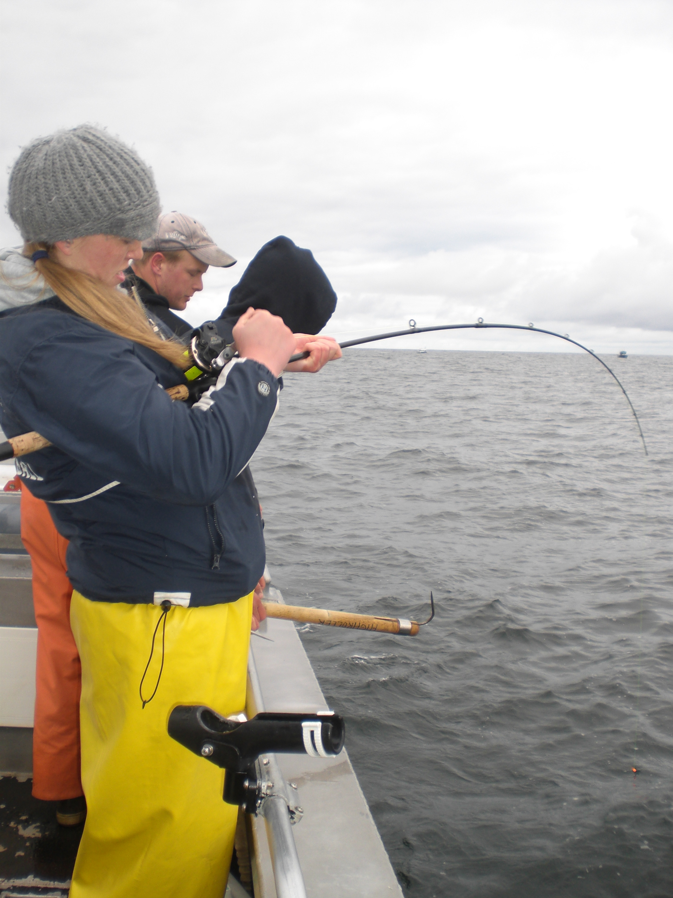 I went mooching for some salmon and, in the mindset of a New Englander who’d been a reluctant angler most of her life, I figured I’d be bored out of my mind waiting for a random fish to swim by and catch sight of my bait. Maybe it’s because there are just so many fish in the area, or because this fishing style works so well, but I had only waited about half an hour for my rod to get nudged by a salmon. And I wasn’t the first to get hit either, we had really only cast down for a few minutes before my friend hooked a whopper.